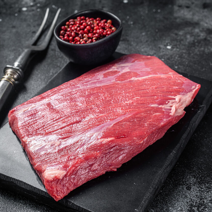 Form & Struktur: Es stammt aus der Bauchwand des Rindes. Es ist ein flacher, ovaler Muskel mit sehr markanten, langen Fleischfasern.